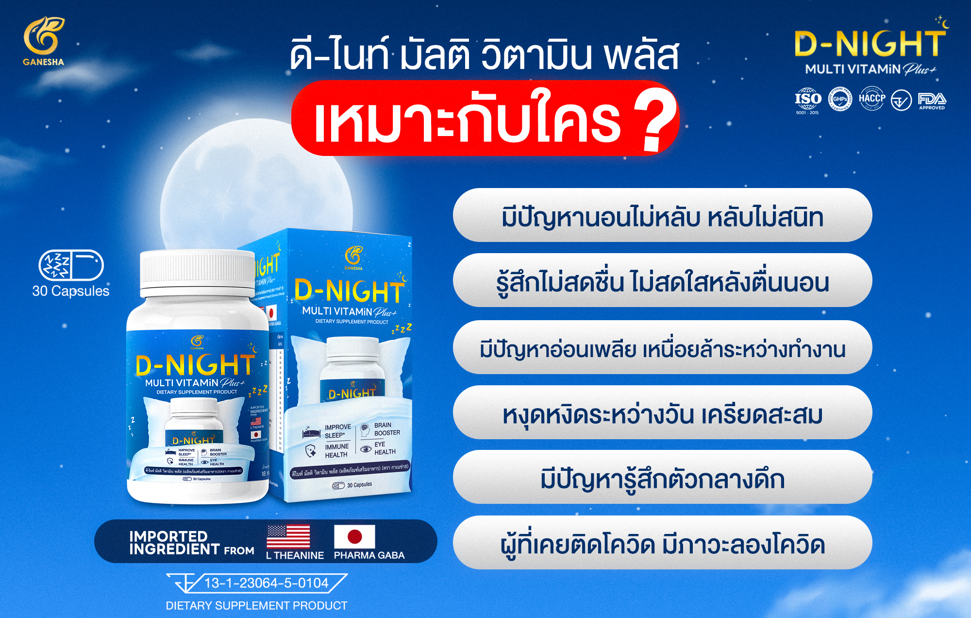 D-night ผ่านการคิดค้น และพัฒนาสูตร ให้เหมาะกับวัยรุ่น วันทำงาน รวมทั้งผู้สูงอายุ และผู้ที่มีโรคประจำตัว อาทิ เบาหวาน ความดันโลหิตสูง และ ไขมันในเลือดสูง เหมาะสมเป็นอย่างยิ่งที่ท่านจะใช้เป็นตัวช่วยในการดูแลตัวเอง และคนที่ท่านรักค่ะ